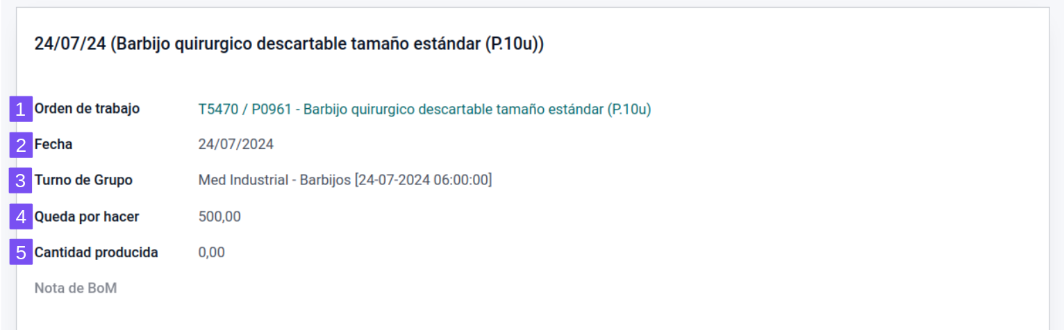 - Turno de grupo: indica el turno asignado y el grupo de producción encargado de la fabricación.