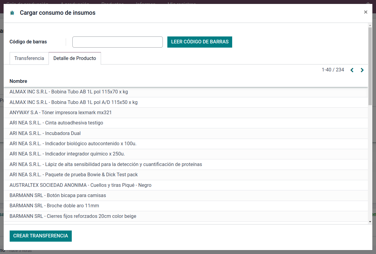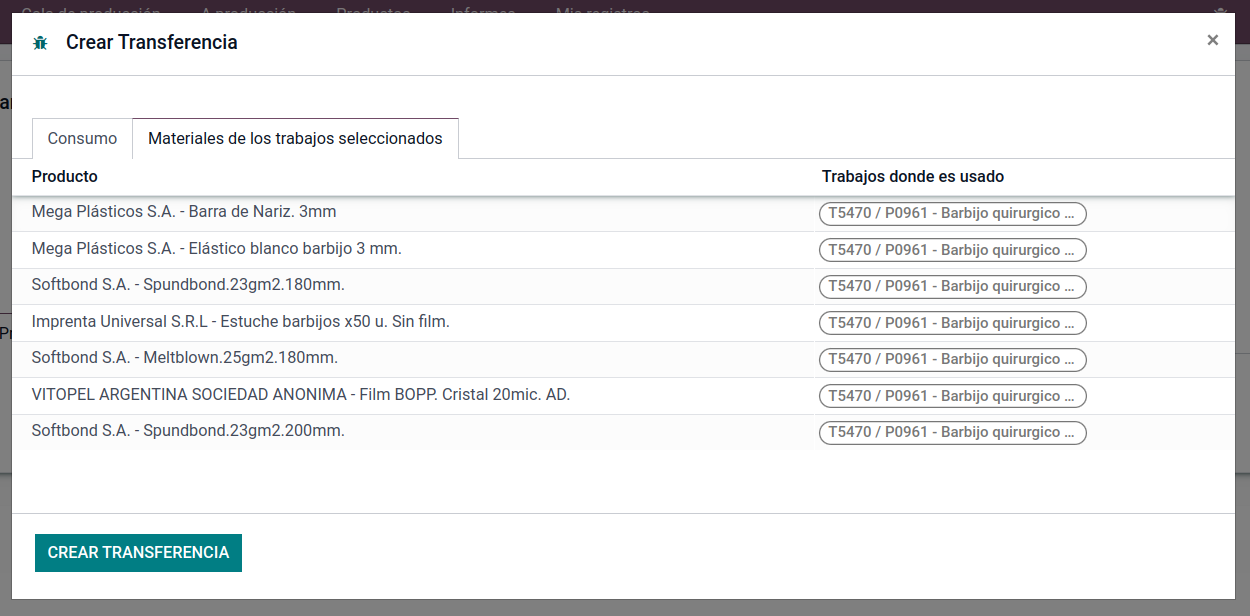 Esta pestaña contiene la lista de los productos que se pueden consumir según la orden de trabajo.