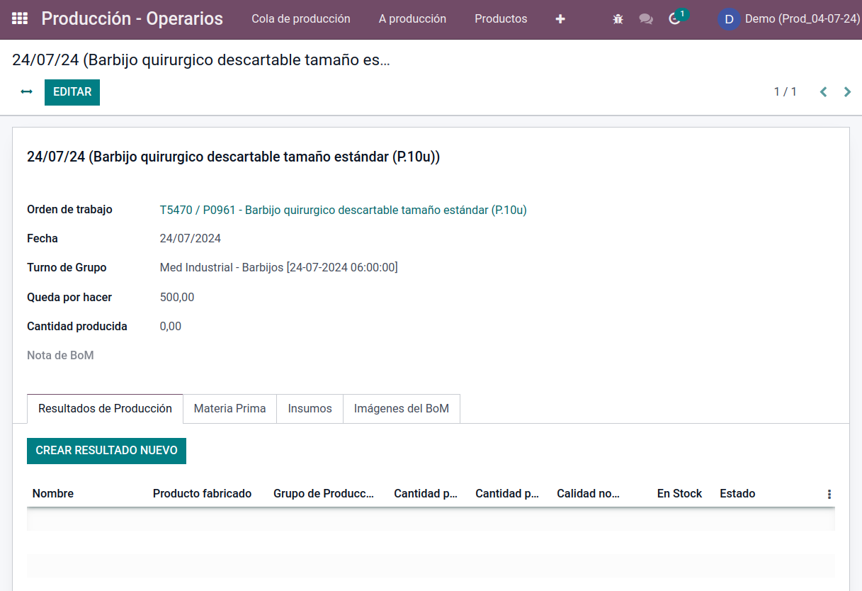 Desde el formulario de un detalle de trabajo se puede ver la información de la producción que se debe realizar, así como cargar los consumos y resultados relacionados a una sesión de trabajo.