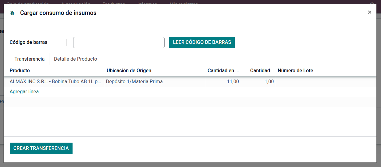 - Agregar línea: botón para agregar una línea nueva al consumo. Ej: si se registró que se consumieron 10 unidades del lote 100 del producto Softbond S.A. - Spundbond.23gm2.180mm pero, también, se consumieron 15 unidades del lote 123, se puede crear una línea con estos datos y cargar el consumo.
