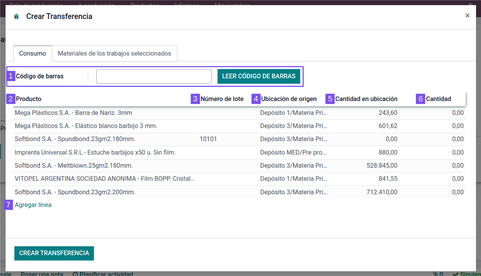 En esta vista se puede especificar cada producto, lote, ubicación y cantidad a consumir: