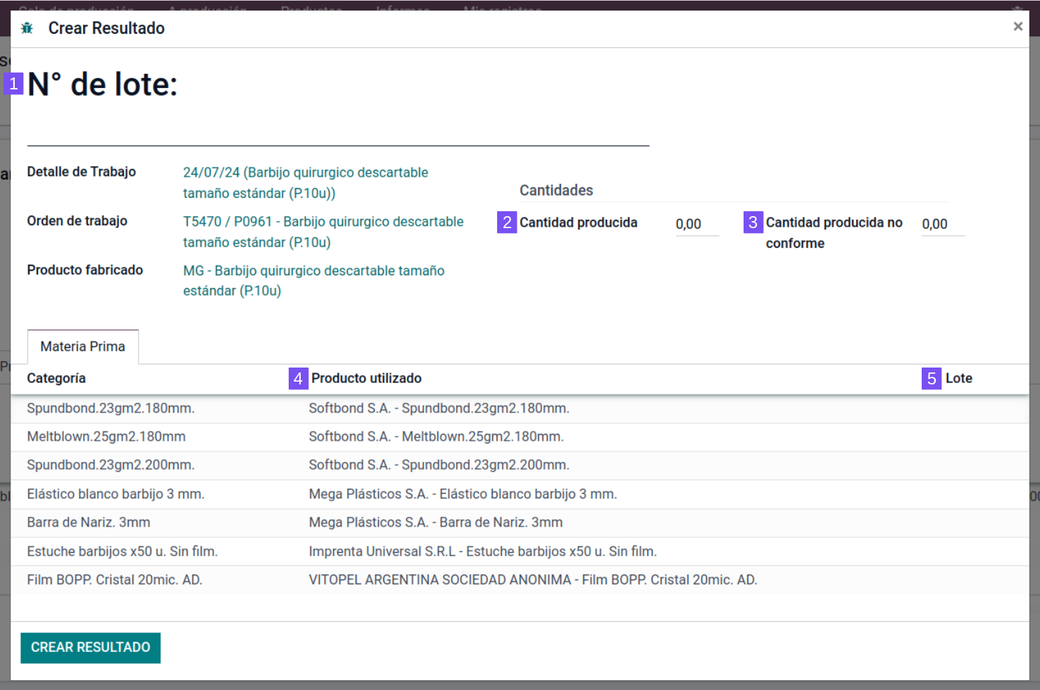 El botón CREAR NUEVO RESULTADO abre la vista donde se puede registrar un resultado. En esta vista se deben ingresar los datos de la producción.