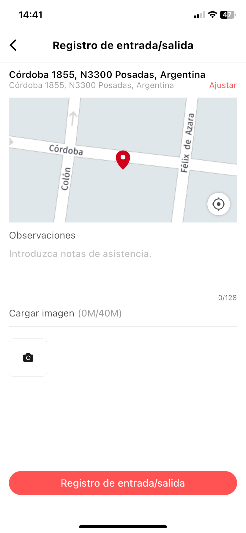 Una vez ingresado ahí, la aplicación va a ubicar con su GPS* y va a dar la posición actual en donde se encuentre el operario. Se deberá también cargar una imagen que en este caso será una foto actual del rostro del operario en ese momento. De otra manera, el registro no podrá ser autorizado. Por lo tanto, el procedimiento de sacar la foto actual no puede ser obviado ni salteado. Una vez cargada la imagen, proceder a seleccionar la opción Registro de entrada/salida. El registro ya estará hecho y el operario ya será registrado en su horario regular de trabajo, como así también, su horario de salida y cortes programados de almuerzo/cena.