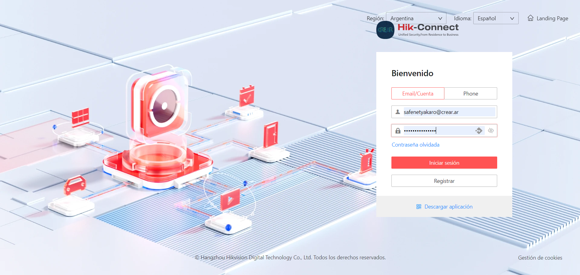 Ingresar en el navegador con el siguiente enlace https://isa.hik-connect.com/views/login/index.html?jump=1#/login