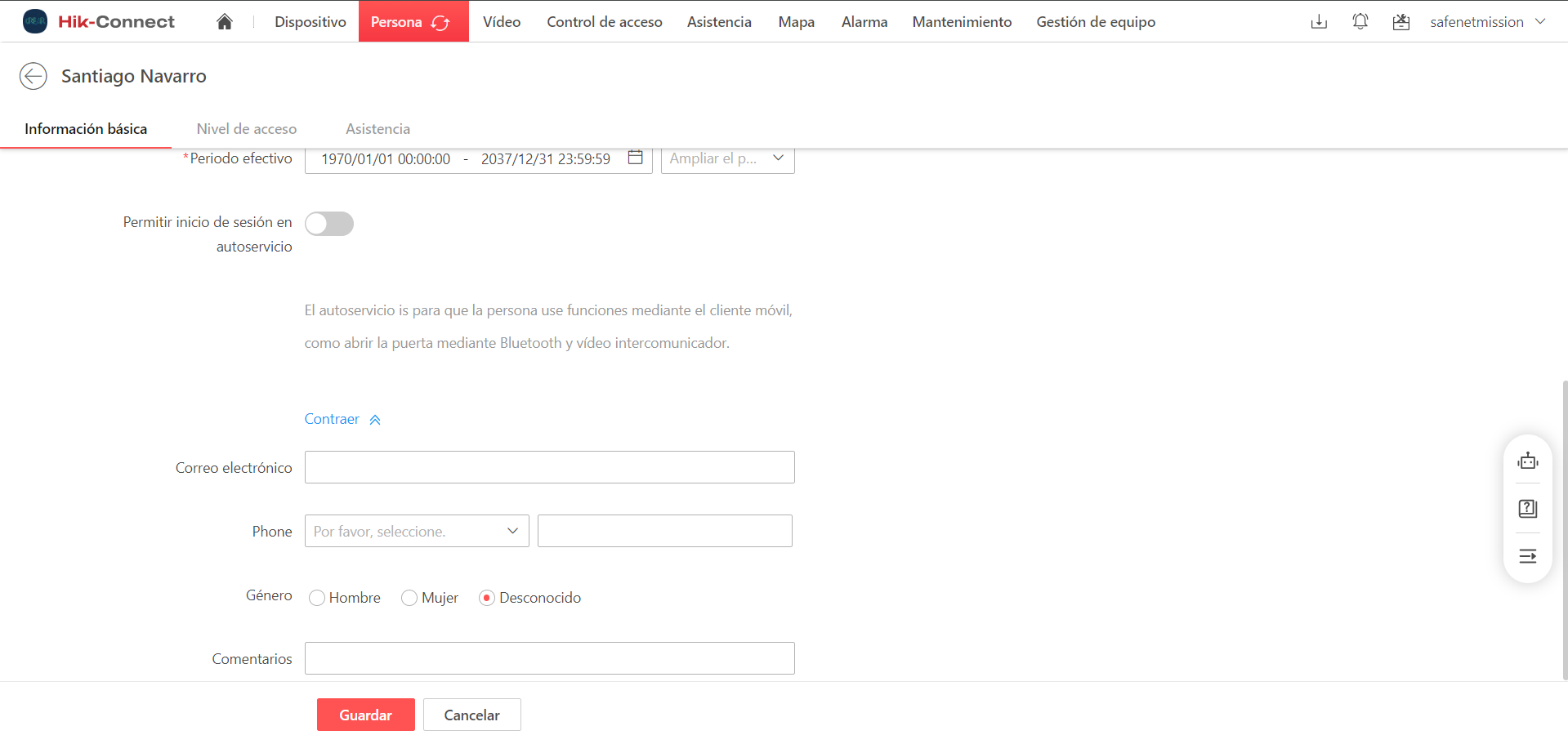 Una vez Importados los usuarios, se deberá sincronizar al usuario con su cuenta de Hik-Connect, la anteriormente creada por el operario. Este paso se realiza ingresando en numero de ID resaltado en azul. Aparecerá la información de usuario y hay que seleccionar ¨Más¨. Una vez ahí se mostrará el espacio para colocar el correo electrónico. Una vez colocado el correo habilitar la opción de ¨Permitir inicio de sesión en autoservicio¨ (En el ejemplo ya esta expandida la pestaña de ¨Más¨ que paso a llamarse ¨Contraer¨)