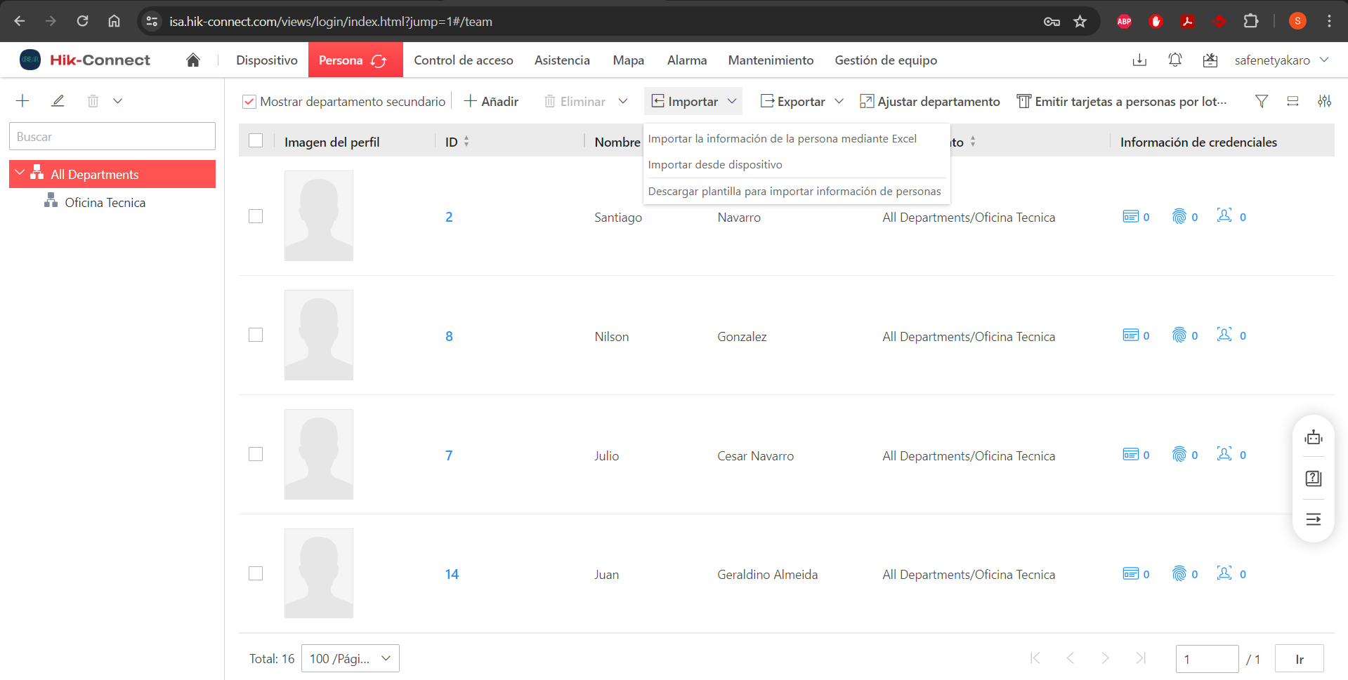 Una vez en esta vista, procederemos a la parte de añadido de personas en ¨Personas¨. En esta ventana tendremos la facilidad de importar desde nuestro dispositivo ¨Control de Acceso¨, los perfiles de los usuarios ya registrados.